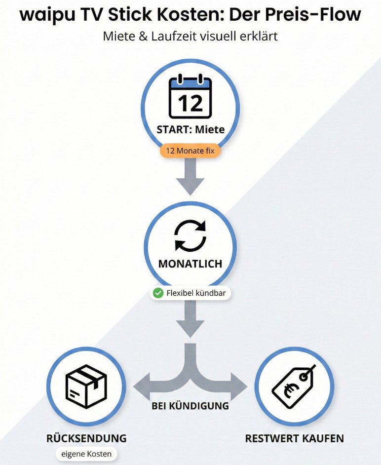 Der waipu TV Stick im Start-Jahrespaket ist ein Leihgerät und bleibt Eigentum von waipu.tv. Nach Kündigung stehen zwei Optionen zur Verfügung: